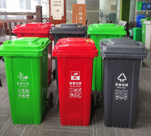8)垃圾桶投放標誌采用絲印工藝製與桶體連接一體,保證垃圾桶使用壽命期間永不脫落